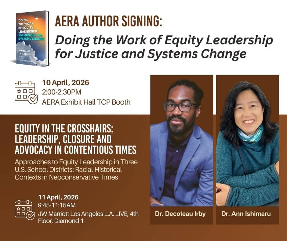 If you are headed to LA for the American Educational Research Association convening this spring, we hope to see you at our book signing, our paper session, or one of the other sessions Dr. Irby or I are part of. My other sessions include a roundtable on Thursday 4/9 with Dr. Dana Nickson, Dr. Sefanit Habtom and (soon to be Dr!) Dawit Alemayehu about the Sankofa of Sustaining Agency in Black family early literacy codesign and a session on Friday at 11:45am with Dr. Rosa Rivera-McCutchen & Dr. Adrienne Goss about Structured Subversion, a strategy for transforming systems with Measures that Matter.
