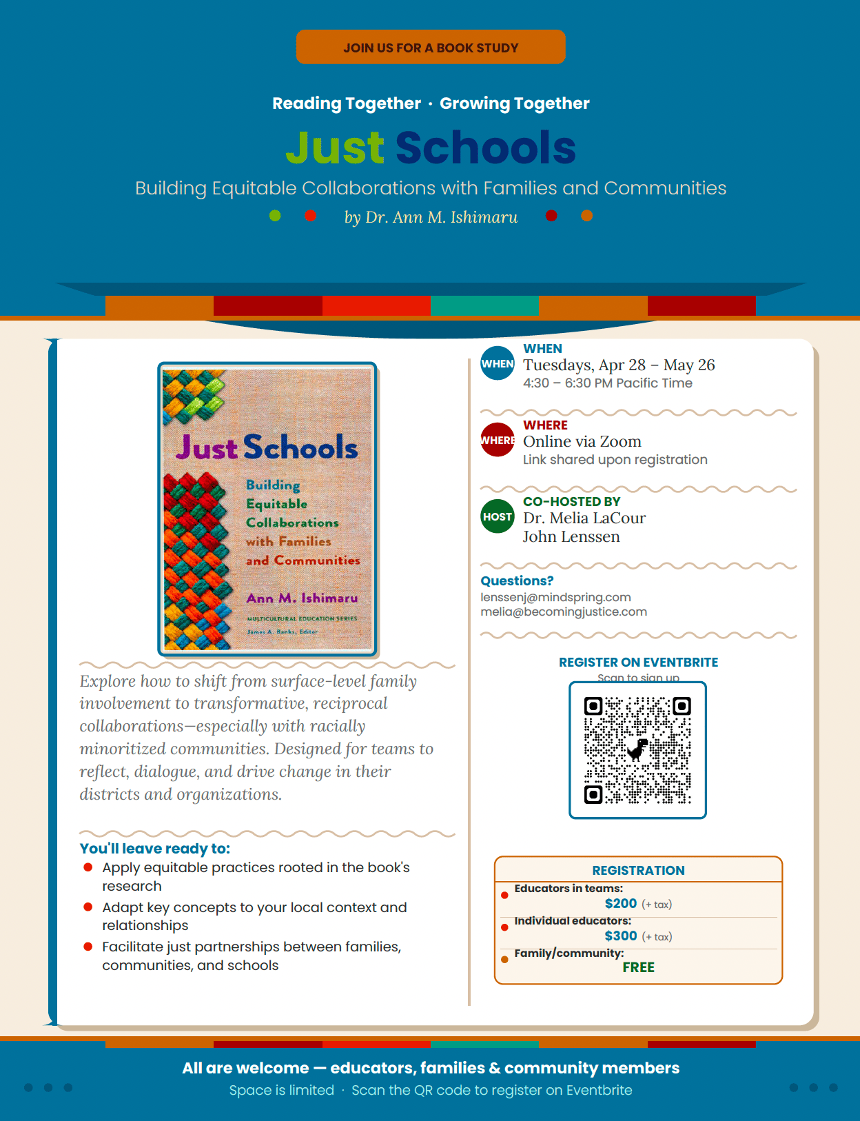 How do we recognize and support cultural brokering? What leadership practices build family leadership and meaningful influence? How do the dynamics of opportunity hoarding exclude and marginalize those designated as “outsiders”? Wow, the parent leaders, district administrators, principals, family liaisons, teachers, and systems educators in the current book study are giving me life in these dim times! What an honor to get to dig into my book with them, along with a rock star facilitation team (thanks to Melia, John, Humberto & Zahra). Due to an overflow of interest, we decided to offer another Just Schools Book study this spring (don’t wait if you are interested!). Once again, parent/family leaders who are part of school/district teams but are not paid district/school personnel are free! Register here.